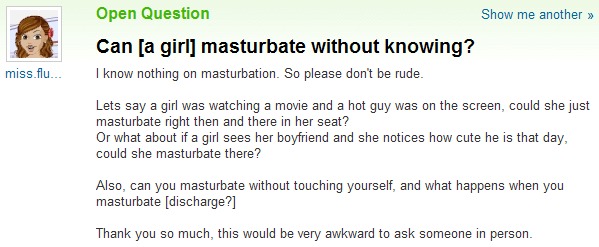 8 aprile 201024 novembre 2014 by La materia non è solida Immagine Uncategorized can a girl masturbate without knowing?, mastrurbarsi, masturbation, può una donna masturbarsi senza saperlo? Lascia un commento theyahooanswers: okchasidy: …WHAT THE FUCK? Condividi:Tweet Fai clic qui per stampare (Si apre in una nuova finestra) Stampa Condividi su TumblrMi piace Caricamento... Correlati
