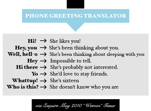 25 aprile 201024 novembre 2014 by La materia non è solida Immagine Uncategorized conversazione telefono, phone greeting traslator Lascia un commento harharhar: theessentialman: According to about 10 of my close female friends, this is eerily correct. Condividi:Tweet Fai clic qui per stampare (Si apre in una nuova finestra) Stampa Condividi su TumblrMi piace Caricamento... Correlati